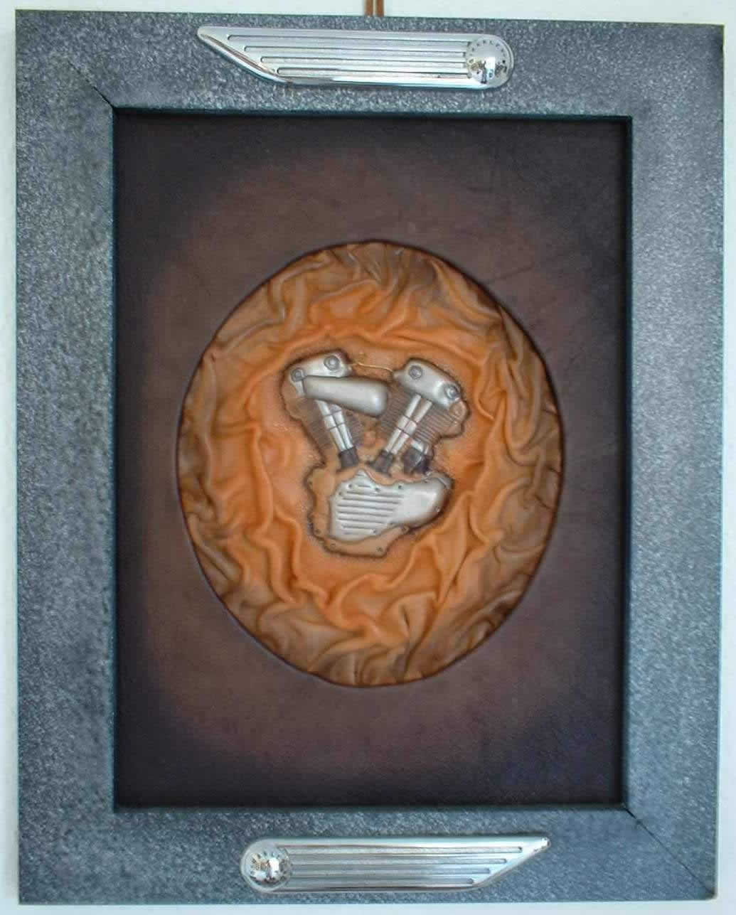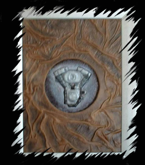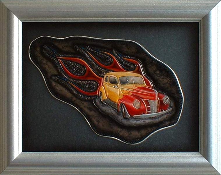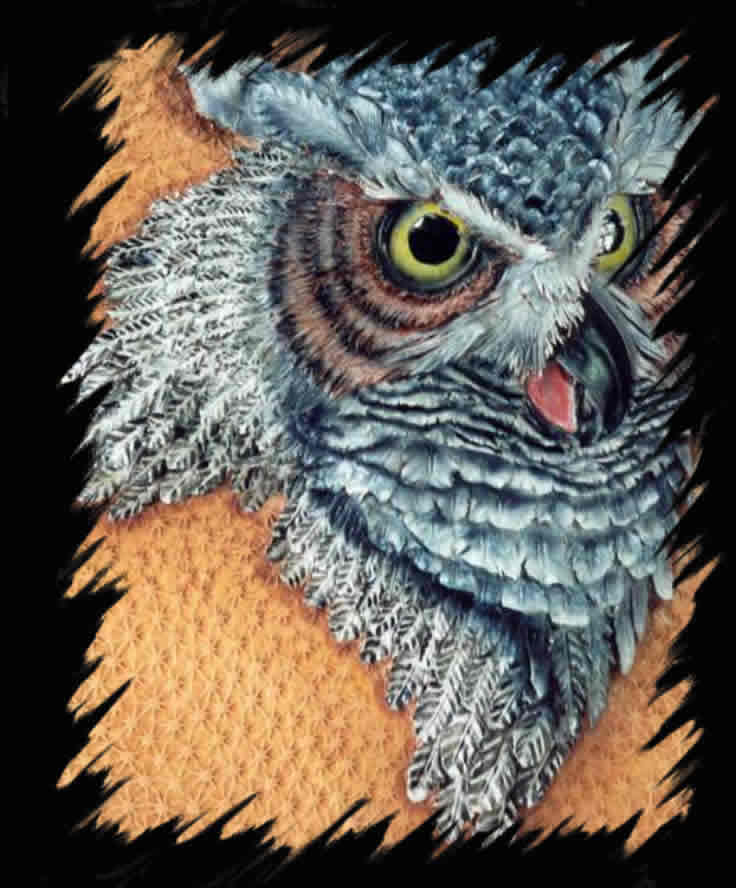 a special 3-D effect. This owl, for example, is completely cut from one piece of leather (the frame is made of wood).